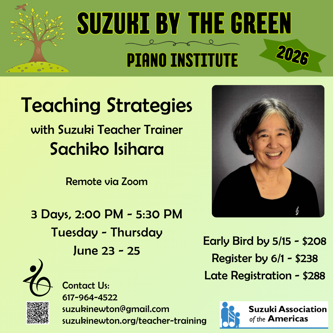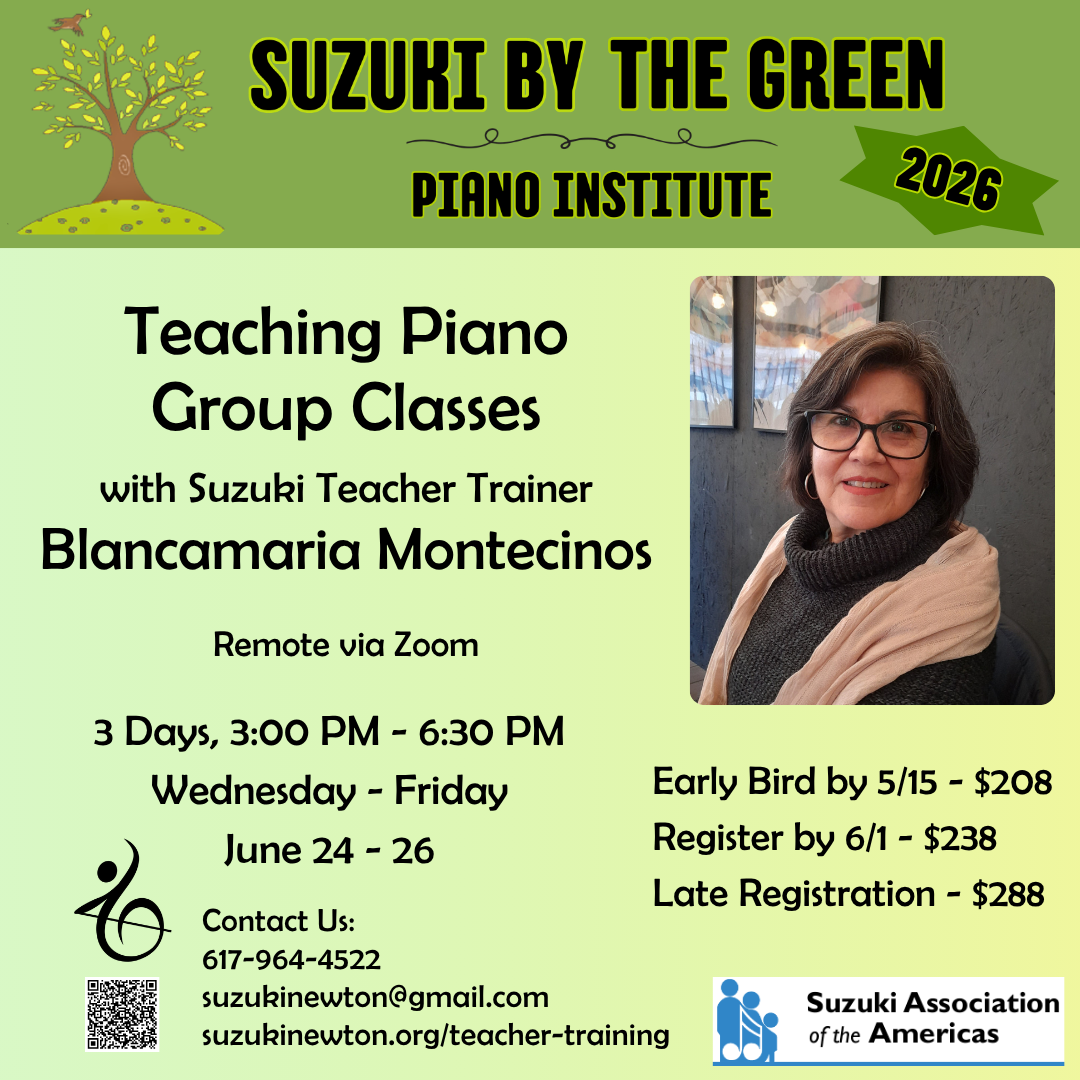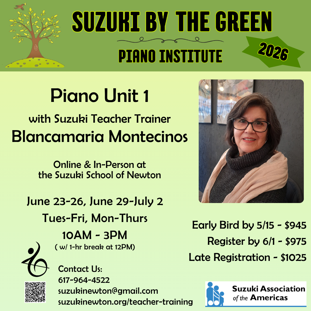 Prerequisites: Suzuki Philosophy (Filosofia) or Every Child Can! and Piano Unit 1 (this class can be taken in conjunction with the Unit 1 course given at Suzuki By The Green).